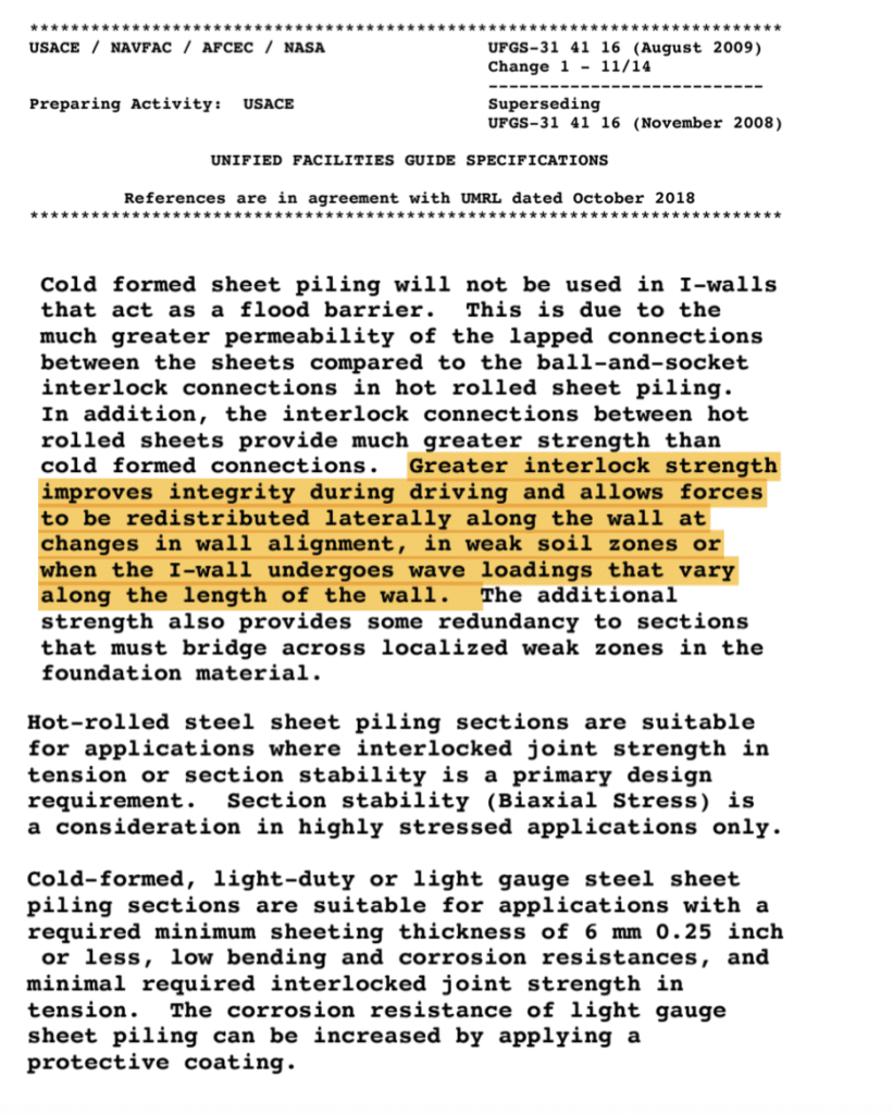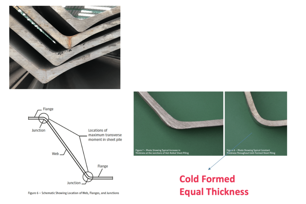 US Army Corp design manual therefore recommends that Hot Rolled Steel Sheet Piles be used for highly stressed applications. Cold Formed should only be considered for sections 6mm or less, with little or low bending and corrosion requirements. See Appendix D.