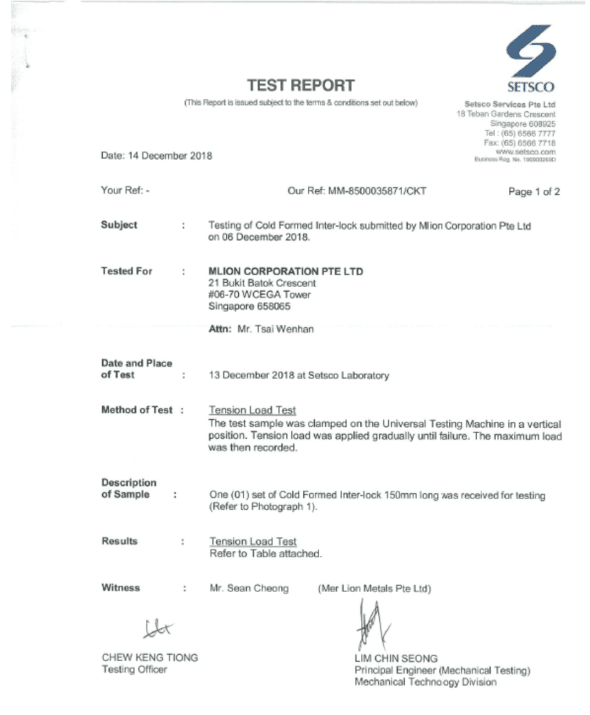 When conducting tensile pull test, it only achieved 79.3 kN or 529 kN/m before failure. Note the cracking across the interlock, a result of possible residual stress in the material after bending. See Appendix B. In comparison, hot rolled O-Pile Connectors which our company sells, of which Nanjing Grand Steel Piling Co., Ltd. is imitating and calling it “GPO” connector, is able to provide 261 kN or 2610 kN/m before failure. See Appendix C. O-Pile Connectors are at least 5 times greater than GPC Connectors.