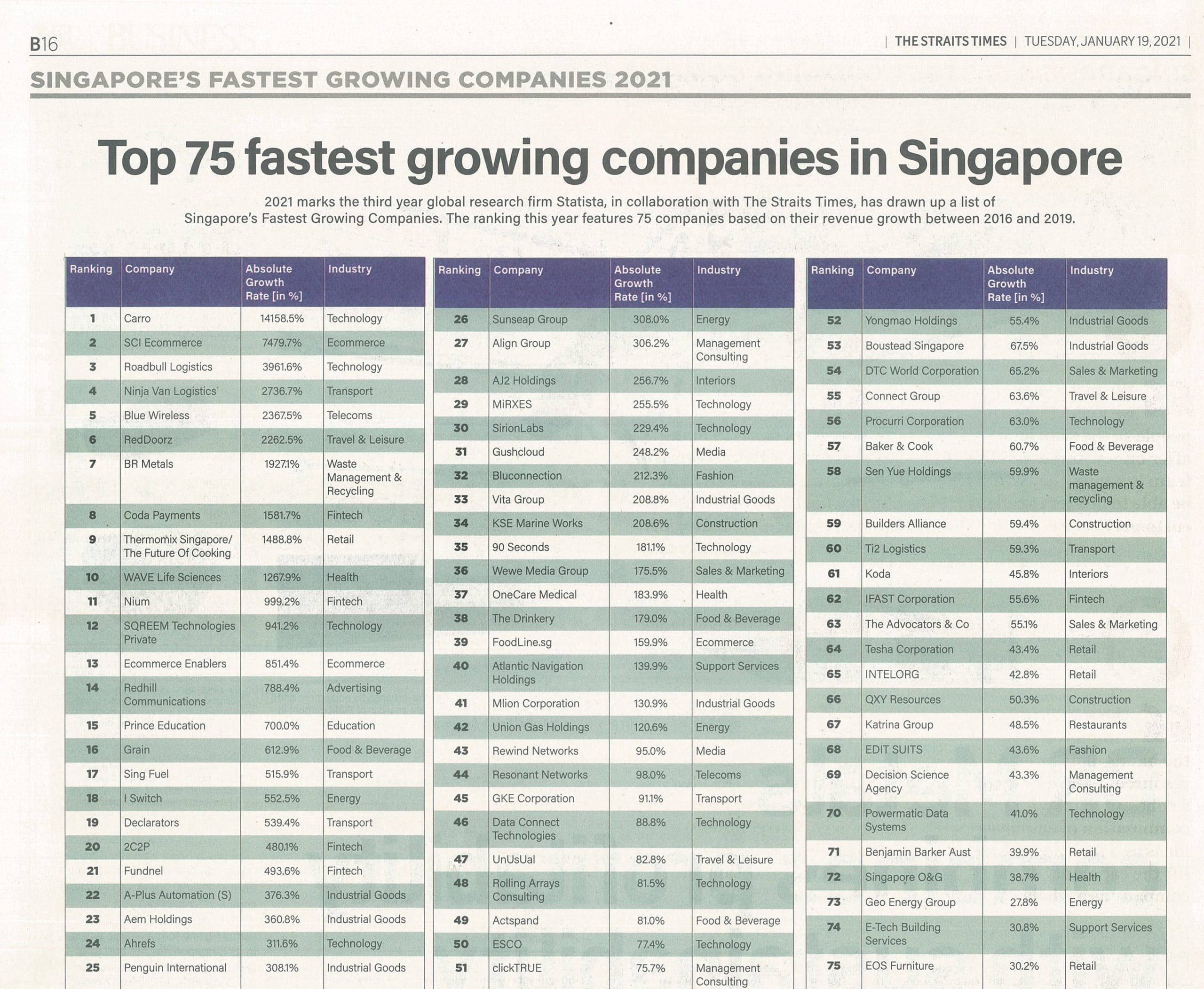 For a 3rd year running, Mlion Corporation has been ranked 41st in the annual Straits Times – Statista research as Singapore Fastest Growing Companies in 2021. This year’s list features a total of 75 companies which ranges across several high growth sectors such as Fintech, Ecommerce and Logistics. The article published in the Singapore Straits Times on 19th January 2021 features the company having an absolute growth rate of 130.9% from 2016 to 2019 and 5th in the Industrial Goods Sector. Mlion was ranked 49th and 51st in 2019 and 2020 respectively.