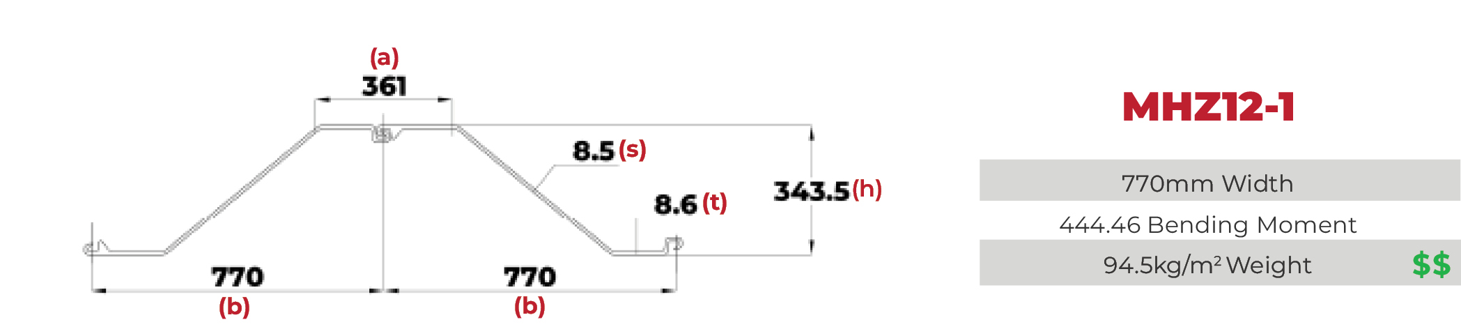| 4 | MHZ12-1 | 770 | 361 | 343.5 | 8.6 | 8.5 | 120.8 | 72.8 | 94.5 | 21496 | 1252 | 444.46 | 0.93 |