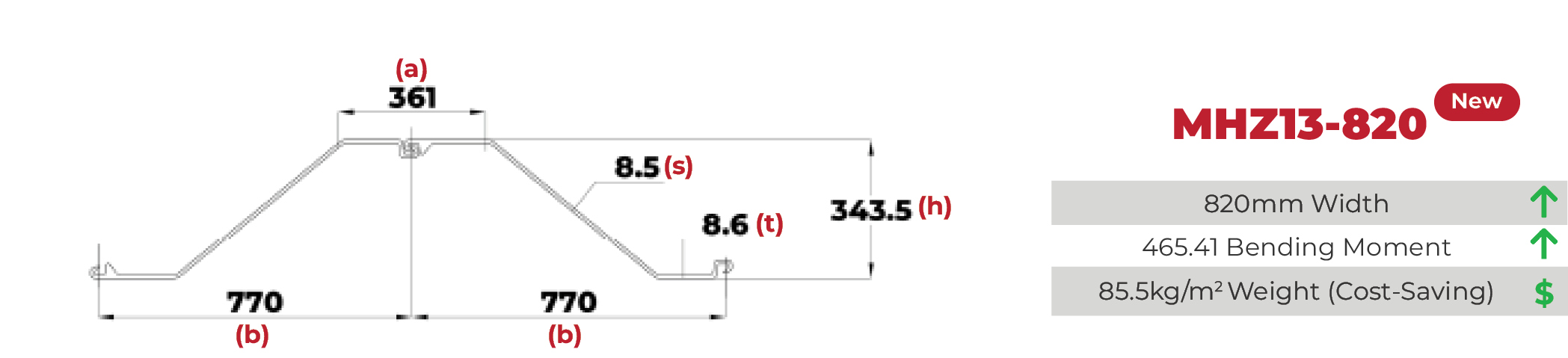 | 3 | MHZ15-820 | 820 | 432 | 380 | 8.8 | 8.7 | 122.39 | 78.8 | 96.1 | 27920 | 1470 | 521.85 | 1.1 |