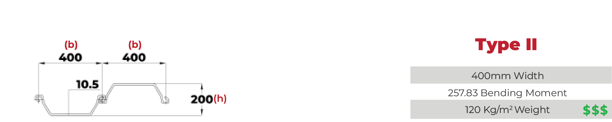 | mm | mm | mm | mm | mm | cm2/m | kg/m | kg/m2 | cm4/m | cm3/m | kNm/m | m2/m | ||